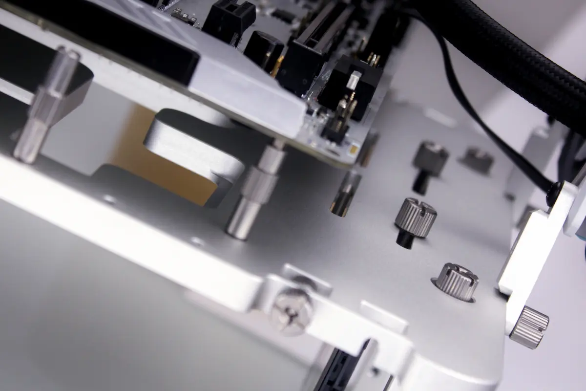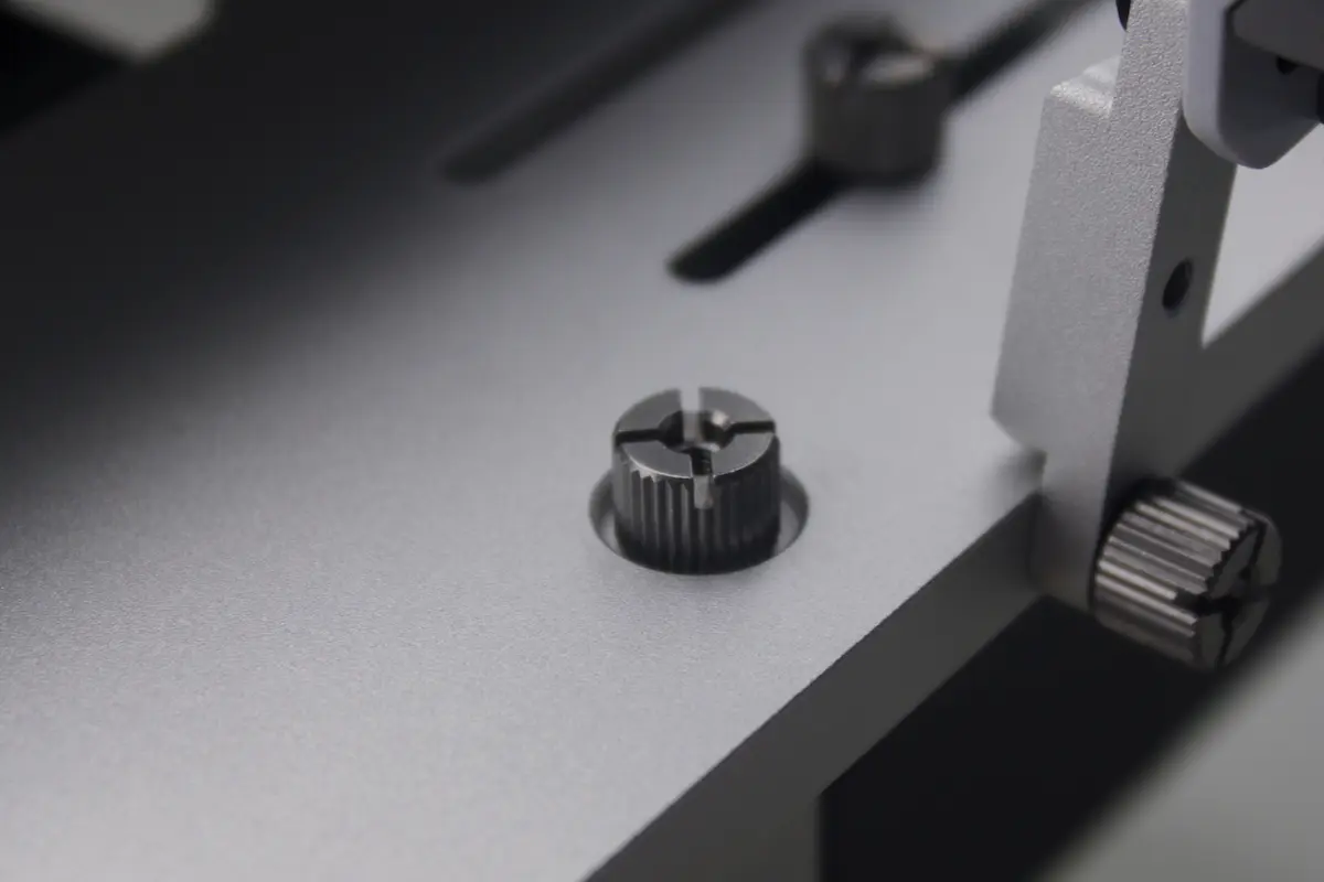 The main body of the Open Benchtable is made of machined, anodized aluminum which offers fantastic rigidity while also being extremely lightweight. The body also features an integrated carry handle with legs, standoffs, and brackets all seamlessly stowed within. This means no moving (or indeed rattling) parts when in transit.