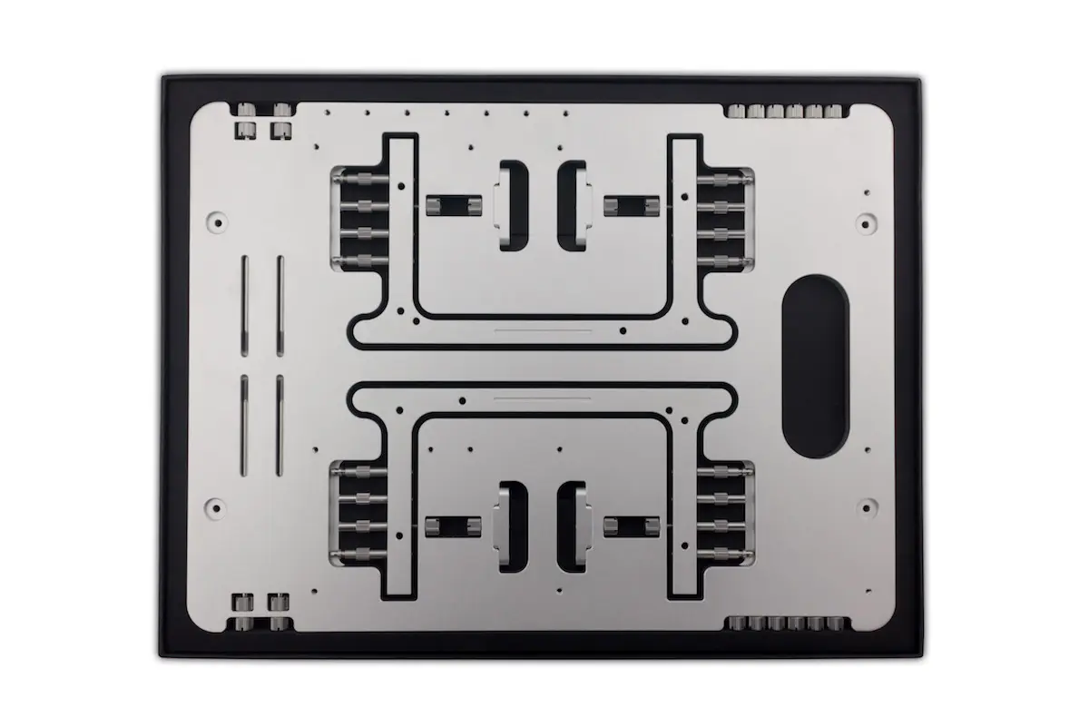 Thanks to the hard work and dedication of Streacom, the current prototype, the Special HWBOT World Tour Edition is a solid proof of concept. Subsequent retail models from Streacom will be branded as the BC1 benchtable. Measuring 36 cm x 27cm and with a thickness of only 8mm, the Streacom BC1 is made from a single piece of milled aluminum, making it light (only 2.5kg), portable yet rugged and ideal for carrying on the road. Despite its sleek light design the Open Benchtable is in fact extremely solid and designed to offer overclockers support for a full subzero cooled rig, including a CPU pot plus four LN2 cooled VGA cards.