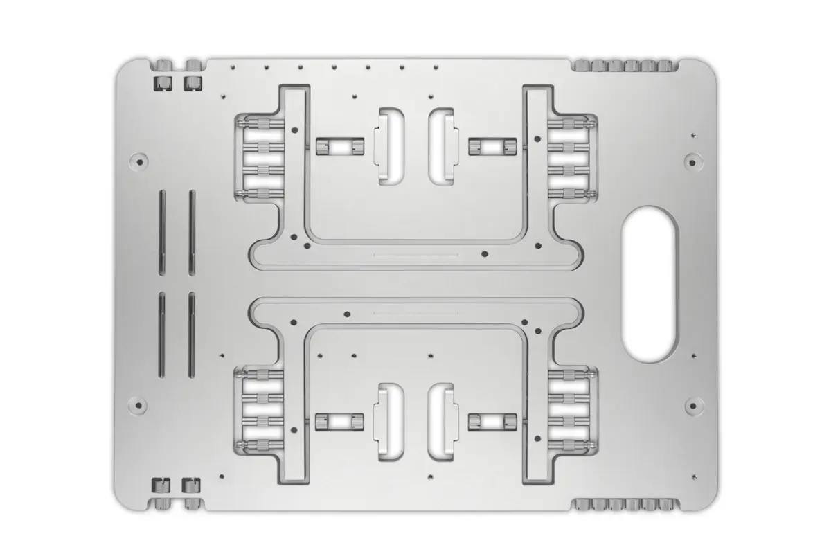 The lightweight BC1 Open Benchtable is eminently portable and fully accommodates the components needed to set up a full system. Its toolless design allows for quick assembly and prevents loss of small components during travel. It is fabricated from a single milled block of aluminum which is sandblast finished and includes custom stainless steel screws for a premium look and feel.