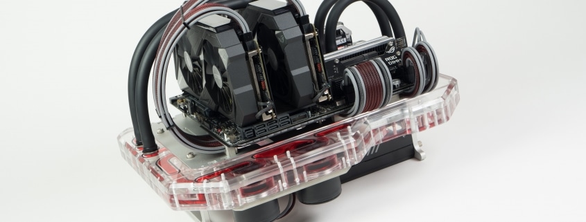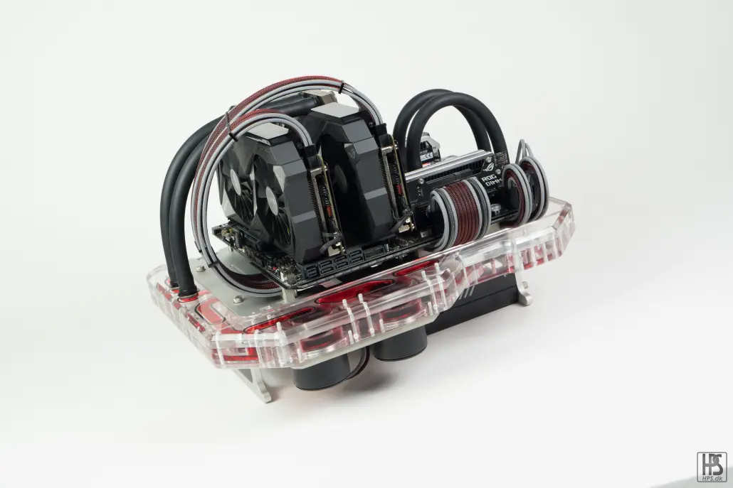 When i first got into this kind of things, the ideas just start rolling, so i tried it out. I just decided that i wanted to do something huge with them, with distro plates [watercooling distribution plate, ed.] and water cooling and a lot of cabling while still keeping it as an actual benchtable. I didn’t want it to go too far away from the original design idea.