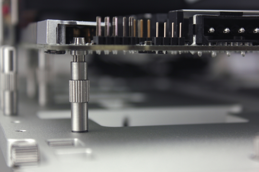 Four of them are the usual screw standoffs that help you secure the motherboard in place. The other four are our fast mounting push-pin standoffs. You can use whichever type suits your needs best.