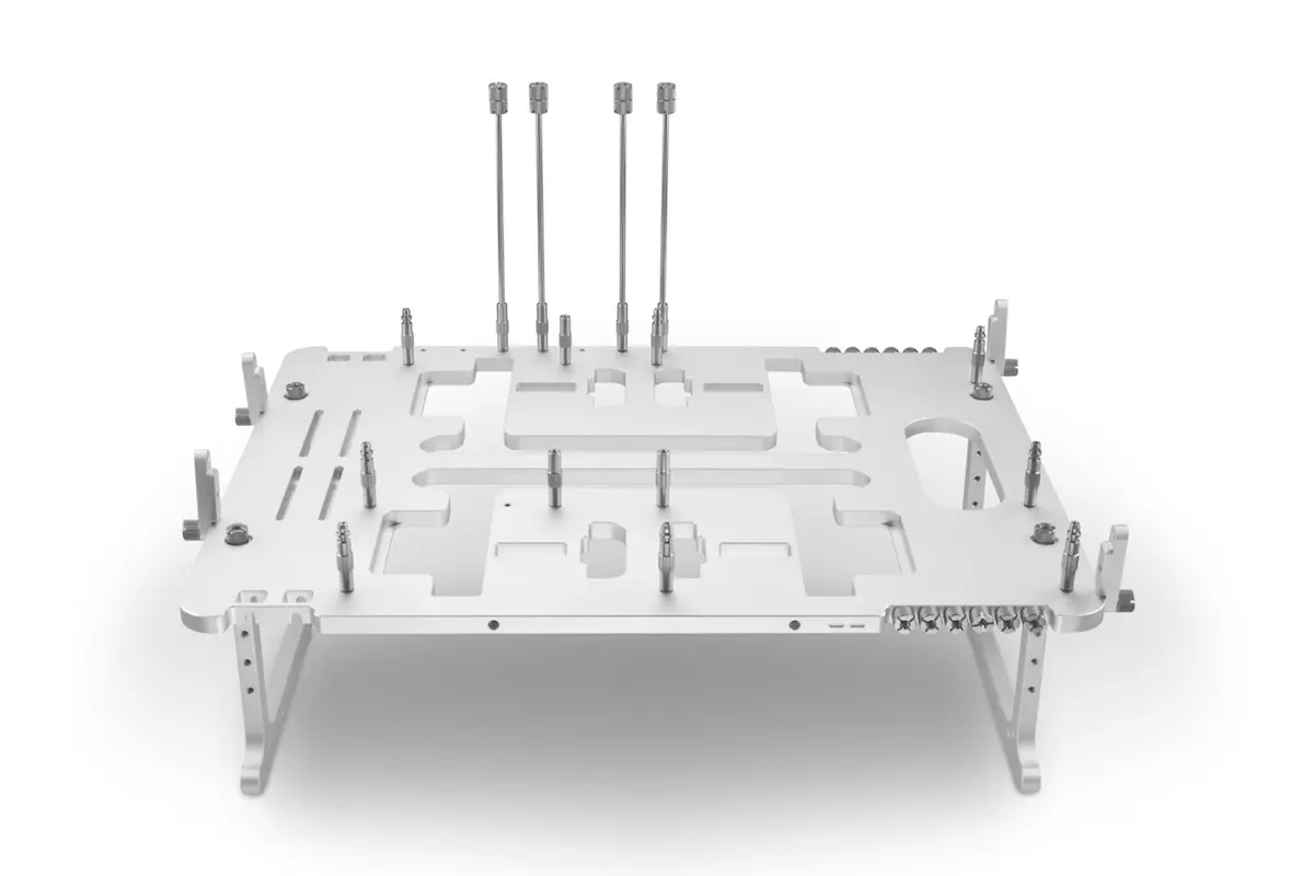 The Open Benchtable has been optimized for true portability, a fact that makes it stand out from other benchtables currently available on the market. It’s only 8mm thick, weighs a just 1.82kg, and is designed for traveling overclockers, enthusiasts and technical professionals. It’s suited to basically anyone who needs to put together a full, open PC while on the road. It’s ingeniously integrated design means that all the components needed to quickly set up a benching station are actually integrated to the main body. These include standoffs, screws and brackets. It really is the next level of convenience and portability.