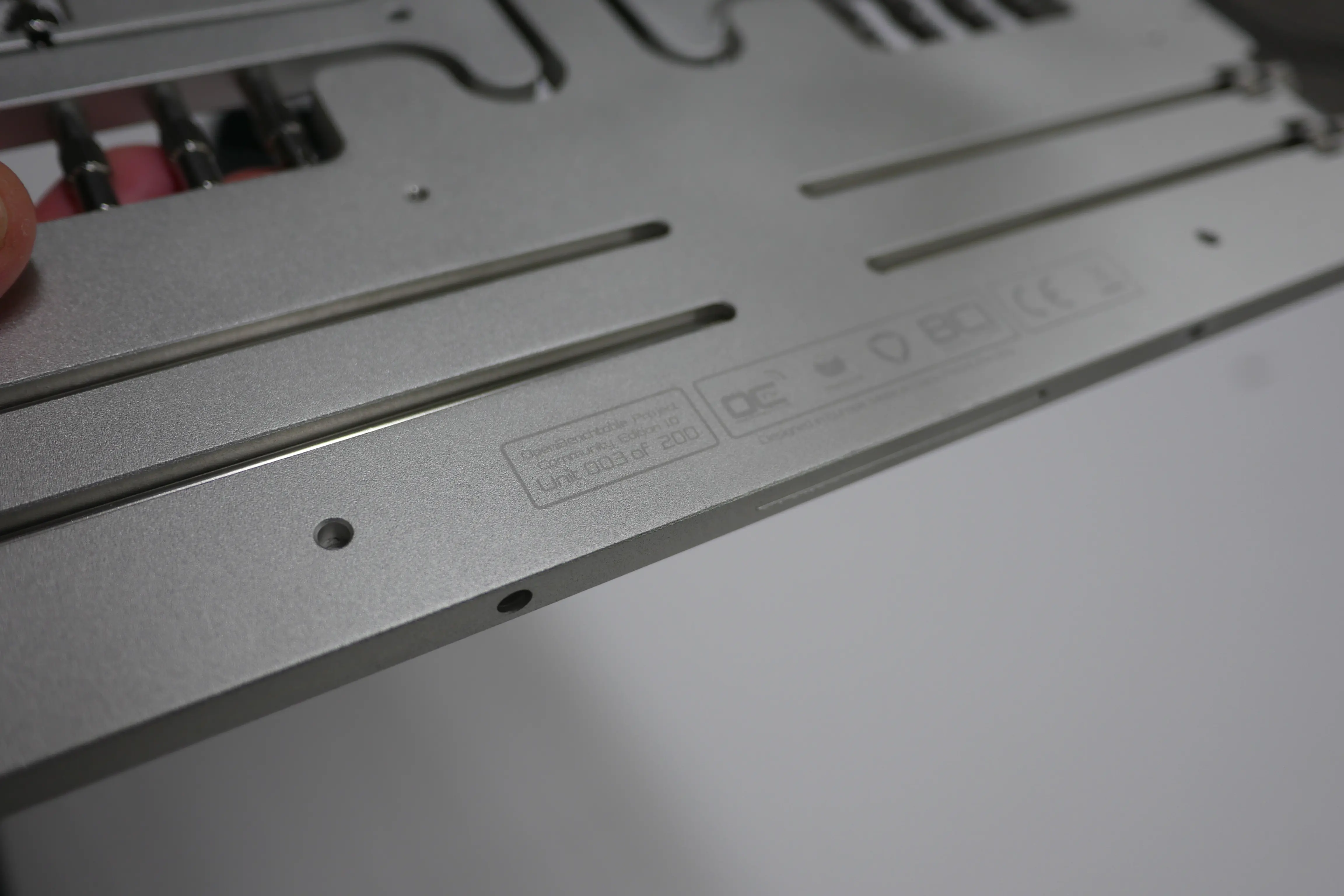 The Community Edition of the Open Benchtable differs from the standard version in that it comes complete with a traveler carry sleeve (see above). The sleeve is black and is made from a durable elastic material that feels good and simply stretches over the benchtable. It’s perfect for keeping it clean and free from dust and corrosion. The Community Edition also features a special engraving which identifies exactly which one it is from an initial run of only 200 pieces. This means that the Community Edition Open Benchtable, truly is a limited edition product (check out the image below).
